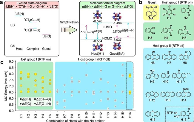 構造室溫磷光材料最簡單有效的方法之一是將主體分子和少量的客體分子進行摻雜。盡管化學家已經合成了大量的主體和客體分子,但是,篩選匹配主體和客體分子仍然大量依賴費時費力的試錯法。因此,可以理性指導篩選主客體分子的通用規則仍然缺失不足。