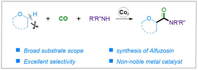 吳小鋒團隊長期致力于各種不同羰基化反應的研究,本工作中,該團隊在前期工作的基礎上,發展了一種新穎的羰基化策略:利用惰性醚作為羰化底物、廉價金屬鈷作為催化劑,在二叔丁基過氧化物存在下,實現醚類化合物的羰基化反應。團隊利用該策略,構建了一系列 -酰胺基取代的醚類衍生物,并獲得了中等收率的可市售藥物阿夫唑嗪。