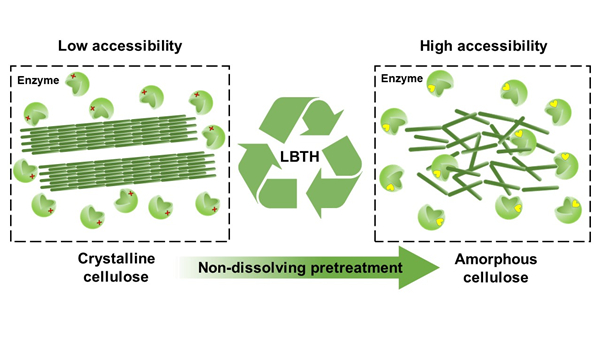 由綠色植物光合作用產生的纖維素可被轉化為生物燃料、生物基材料、或生物基化學品。所以,作為天然可再生的碳負資源,纖維素的利用前景廣闊。但天然纖維素具有高結晶的超分子結構,其高比例的有序且致密的纖維素I型結晶結構,使其水解和功能性改性的效率較低,限制了纖維素的有效利用。為此,需要開發清潔性、低能耗的高效預處理技術來打破纖維素的致密結構,增加其轉化和利用效率。相比于高能耗的物理法預處理和時效性相對較低的生物法預處理,化學法預處理更加高效,特別是可循環利用的綠色溶劑體系的使用。