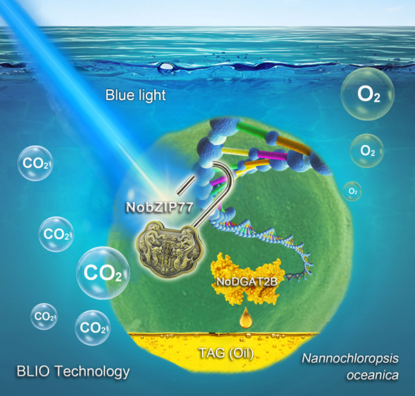 在尋覓誘導TAG合成新方法的過程中,單細胞中心博士后張鵬和副研究員辛一帶領的研究小組在工業產油微藻Nannochloropsis oceanica(海洋微擬球藻)中,發現了一個前所未知的“BlueLight-NobZIP77-NoDGAT2B”通路。當培養環境中氮素豐富時,藍光感應轉錄因子NobZIP77會通過與目標DNA調控序列的結合,抑制NoDGAT2B等TAG合成酶的轉錄表達,從而關閉了TAG生產線。然而,當環境中氮素耗盡時,細胞中通常吸收藍光的葉綠素a會減少,導致更多藍光進入NobZIP77所在的細胞核。這樣,暴露在藍光下的NobZIP77會從其目標DNA調控序列上解離,因此NoDGAT2B等TAG合成酶的轉錄表達被“解鎖”,從而觸發TAG的生產。