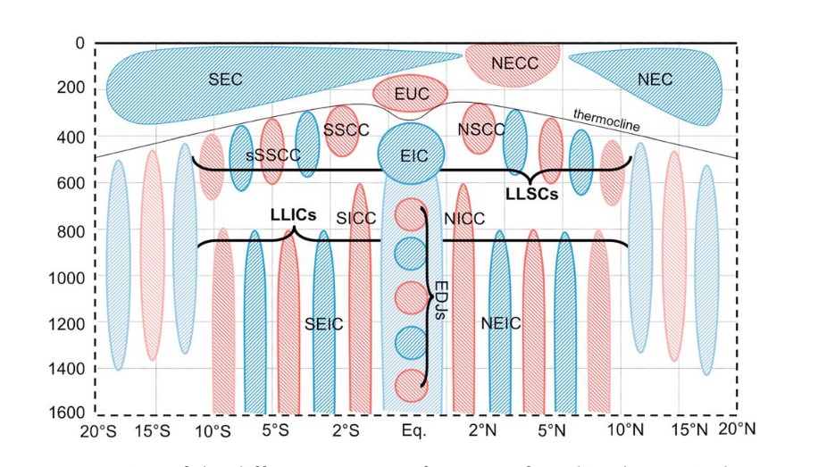 赤道中層流東西緯向交替變化的結構特征,引自M nesguen et al. (2019)。本研究關注位于赤道上400-1000米的EIC及EDJs的一部分