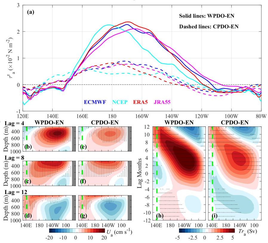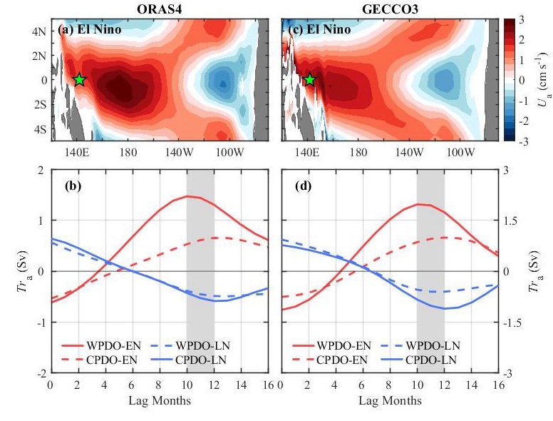 赤道中層流系統會在滯后厄爾尼諾事件10-12個月時出現較強的東向流異常。在此基礎之上,研究團隊利用長時序的再分析數據發現該東向流異常在年代際尺度上進一步受PDO的調制。PDO暖位相下厄爾尼諾引起的中層流輸運異常最大值是PDO冷位相下量值的2倍,且發生時間提前2月。進而利用連續層化模型的系列數值試驗,研究揭示上述PDO的年代際調制作用主要歸因于PDO引起的赤道中太平洋風場變化。相比PDO冷位相,PDO暖位相下厄爾尼諾事件中赤道中太平洋的西風異常更強且位置偏東,其激發的Kelvin波最大振幅更大且位置偏東,Kelvin波在東邊界反射成Rossby波,Rossby波的垂向傳播引起西太平洋中層輸運異常的最大值更大且發生時間更早。