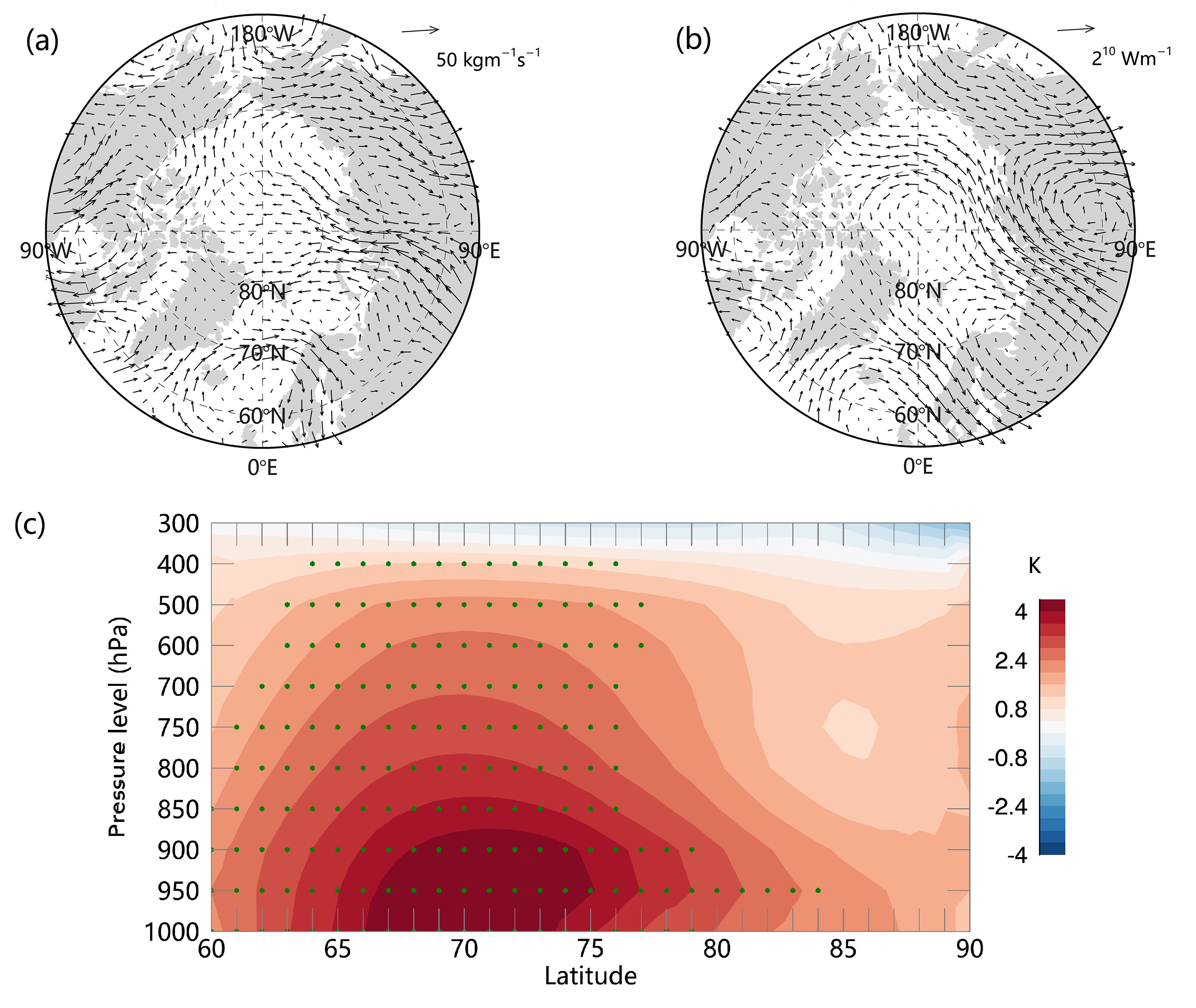 多源衛星遙感觀測數據表明,2020年7月北極海冰范圍(SIE)出現衛星觀測以來(1979-)的極小值7.29 106 km2,海冰覆蓋顯著減少主要發生在歐亞大陸附近的邊緣海,包括喀拉海、拉普捷夫海和東西伯利亞海。基于模式數據和氣象再分析資料,研究團隊發現,2020年春季(4-6月份)大量水汽和能量由歐亞大陸通過喀拉海附近進入北極,并在海冰衰退區域匯聚,造成局部區域大氣溫度升高、水汽含量增多,加強了溫室效應,進而導致上述海域向下長波輻射和湍流通量增加,融冰期提前開始。海冰融化開始后,激發了反照率正反饋機制,促進研究區域海冰覆蓋范圍的進一步減少。深入分析表明,2020年春季異常高的大氣水汽和能量輸入北極主要是由特定的大尺度大氣環流模態控制的,此外,氣旋活動對大氣水汽和能量輸送也起到了關鍵作用。總的來說,2020年春季觀測到氣旋的典型軌跡與總能量和水汽輸送的路徑非常吻合,研究區域附近更多、更強的氣旋活動可能加強海冰漂移的氣旋異常,有利于裂隙、冰間湖的形成,促進反照率正反饋機制。本研究對大氣水汽和能量輸送對海冰變化的調控作用和內部機制有一定的啟示,有助于加深氣候變暖背景下對北極地區大氣-海冰相互作用機制的理解。