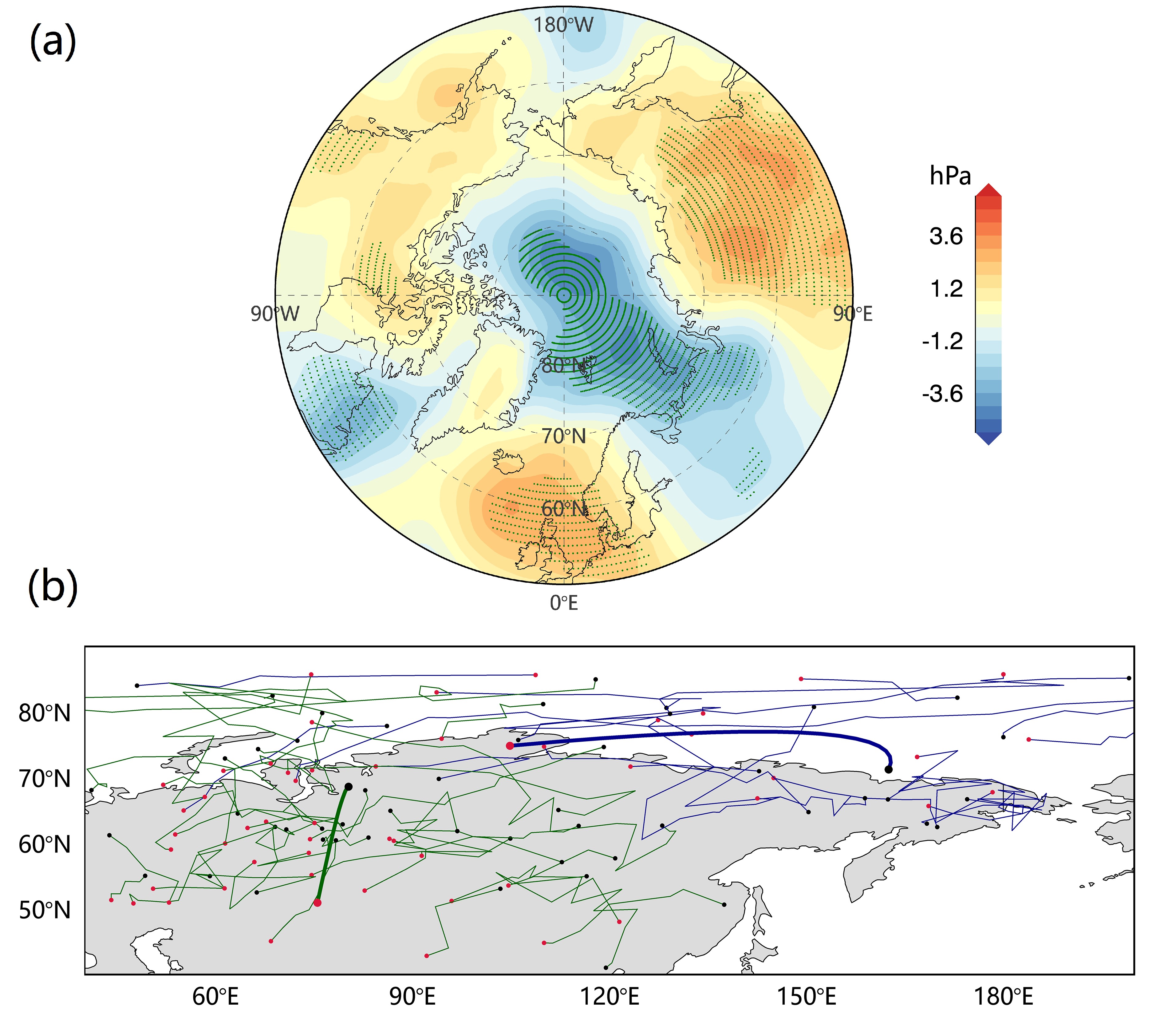 2020年春季(4-6月)(a)SLP異常場以及(b)大氣水汽和能量路徑附近氣旋活動的 軌跡(細線)及兩個典型軌跡(粗線),紅點表示氣旋生產,黑點表示氣旋消亡 (Liang et al., 2022)