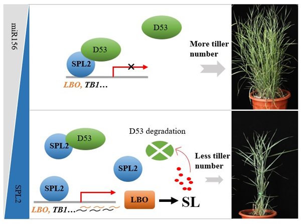 科研人員發(fā)現(xiàn)在重要的能飼作物柳枝稷中,miR156靶基因SPL2編碼的蛋白不但能夠與獨腳金內(nèi)酯信號通路核心蛋白D53相互作用,還能夠通過激活植物側(cè)分枝氧化還原酶基因LBO的表達增強獨腳金內(nèi)酯合成,進而引起D53的泛素化降解,在一定程度上解除D53對SPL2的抑制作用。而釋放的SPL2能夠發(fā)揮其轉(zhuǎn)錄因子調(diào)控的功能,促進下游分蘗形成關(guān)鍵抑制因子(例如TB1)的表達(圖1)。該機制能夠從獨腳金內(nèi)酯合成層面幫助SPL克服由于D53過量積累導(dǎo)致的分蘗持續(xù)產(chǎn)生問題,從而實現(xiàn)植物生長發(fā)育過程中對營養(yǎng)分蘗數(shù)目的精準(zhǔn)控制。該研究解析了miR156-SPL與獨腳金內(nèi)酯合成通路在柳枝稷分蘗調(diào)控網(wǎng)絡(luò)中的關(guān)系,發(fā)現(xiàn)了miR156-SPL2-LBO介導(dǎo)的分蘗調(diào)控新機制,進而在獨腳金內(nèi)酯合成調(diào)控層面闡述了miR156-SPL模塊精準(zhǔn)控制分蘗形成的功能,為今后能源草和牧草理想株型的分子設(shè)計提供了重要的理論基礎(chǔ)。