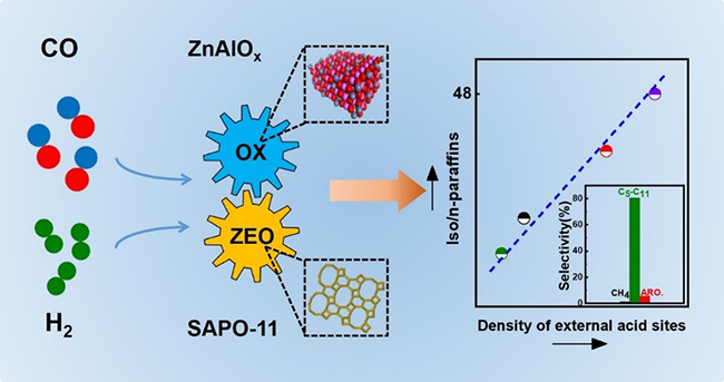隨著石油資源的逐漸消耗以及不斷波動的價格,開發非石油資源制備液體燃料的技術具有重要的意義,其關鍵是設計開發具有高選擇性尤其是高異構烷烴選擇性、高穩定性的催化劑。團隊在前期工作基礎上(Angew. Chem., Int. Ed.,2019),通過調變分子篩的酸性位分布,實現了34%一氧化碳轉化率,以及82%汽油選擇性,其中異構烷烴/正構烷烴的比例高達38,150h測試顯示該催化劑具有良好的穩定性。在優化反應條件下,團隊實現了異構烷烴/正構烷烴的比例高達48,是迄今合成氣直接轉化領域報道最高值。本工作進一步研究結果顯示,分子篩外表面酸性位是異構烷烴尤其是多支鏈異構烷烴生成活性位。本研究為合成氣以及CO2直接轉化為高品質汽油提供了重要指導。