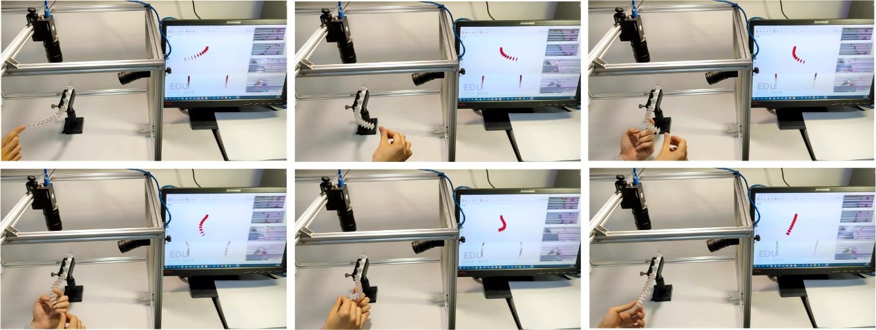 該研究提出了一種新穎的連續體機器人形狀感知方法,通過在連續體機器人內部增加被動腱,將連續體機器人的形狀變化轉換成被動腱的位移信息,并通過相機實時獲得被動腱的位移,進而基于幾何運動旋量重建出連續體機器人的空間三維形狀。這一方法不僅能夠獲得連續體機器人的曲率、撓率等信息,也能夠感知連續體機器人的扭轉變形,相較于其它方法具有低成本和高可靠性優點。