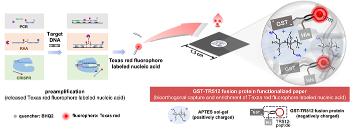 近日,中國科學院大連化學物理研究所化學傳感器研究組研究員馮亮團隊與蛋白質折疊化學生物學創新特區研究組研究員劉宇團隊合作在病毒核酸快速檢測研究中取得新進展。團隊發展了一種低成本、快速和便攜式病毒檢測策略,該策略依賴蛋白功能化修飾的紙基對熒光信號的生物正交富集,輔以實驗室自制的微型DNA加熱裝置和手持熒光檢測儀,可以實現對病毒核酸陰陽性的快速區分。