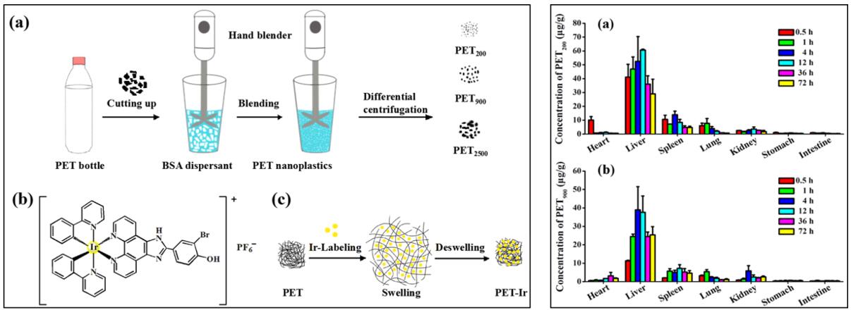 圖1. 以礦泉水瓶為原料的PET納米塑料制備、銥元素標記示意圖,以及靜脈注射條件下納米塑料在小鼠體內的定量分布