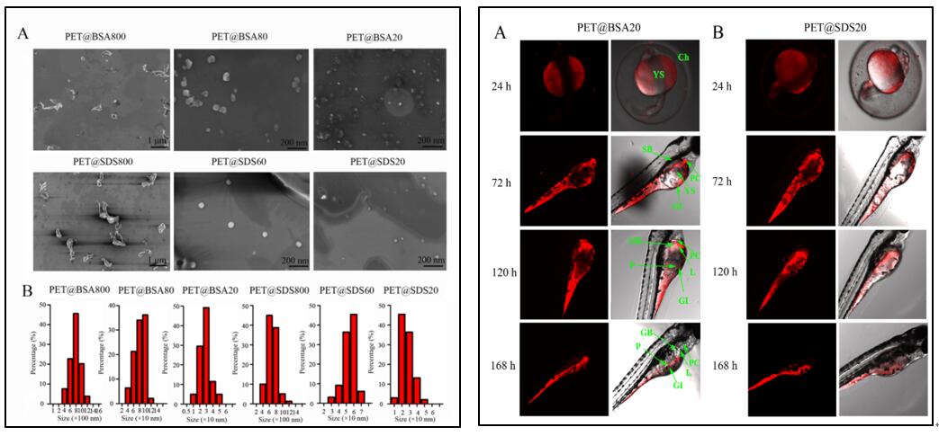 圖2. PET納米塑料的掃描電鏡和粒徑分布,以及在斑馬魚卵和幼魚體內的分布