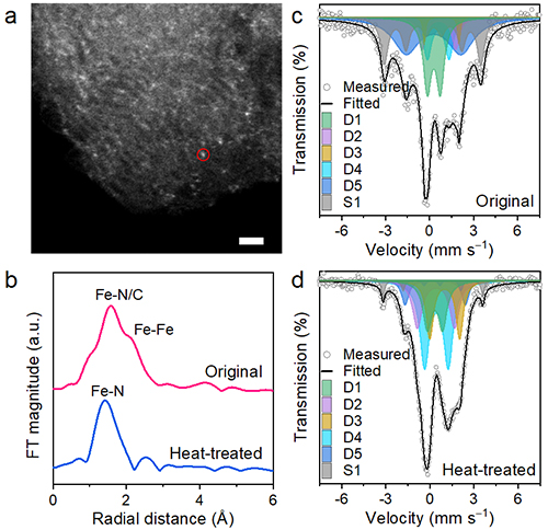 本研究中,王軍虎團(tuán)隊(duì)利用57Fe穆斯堡爾譜技術(shù)揭示了Fe單原子催化劑的配位環(huán)境(主要為Fe4N結(jié)構(gòu)),明確探測到了少量難以被其它方法確定的Fe原子簇,并確定為碳化三鐵(Fe3C,S1)。研究發(fā)現(xiàn),經(jīng)過熱處理提純后,即使樣品中的Fe3C團(tuán)簇僅有4%,也可以被輕易檢測到。該實(shí)驗(yàn)表明,57Fe穆斯堡爾譜技術(shù)是精確表征Fe單原子催化劑純度可靠并不可或缺的技術(shù)。