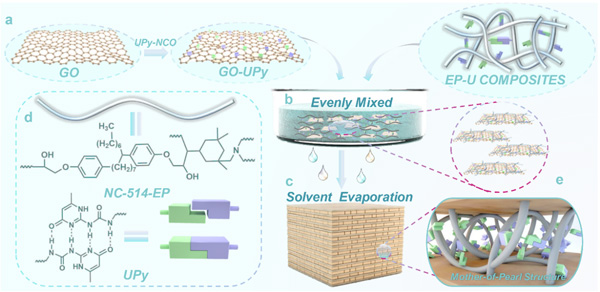 圖1:自修復仿生納米材料的構建策略示意圖。 (a) GO與生物基環氧樹脂的預處理和混合路線; (b) 通過攪拌分散機獲得的高分子納米材料的懸浮體系; (c) 溶劑蒸發得到的珍珠狀納米復合材料; (d) 生物基聚合物網絡和具有超分子四重氫鍵的UPy的結構圖;(e) 人造珍珠層的結構和超分子氫鍵締合的原理。