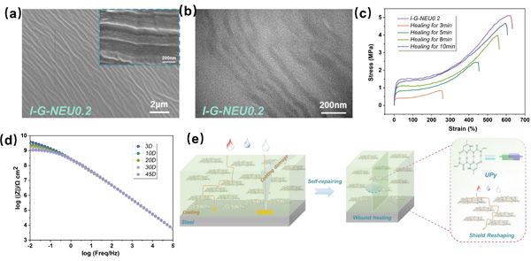 圖2:仿生納米復合涂層:橫截面顯微示意圖(a)SEM和(b)TEM;(c)Stress-Strain曲線;(d)在 3.5 wt% NaCl 溶液中浸泡 45 天的電化學EIS圖;(e)防腐蝕機制與自修復原理示意圖。