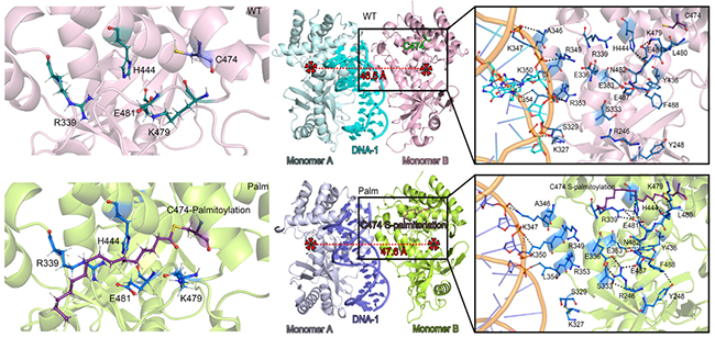 大量的研究認為cGAS活性的改變與先天免疫反應沉默(cGAS過度抑制)和自身免疫性疾?。╟GAS過度激活)的發生息息相關。因此,必須對cGAS活性進行良好調節,防止過度抑制(導致先天免疫反應沉默和病原體入侵)和過度激活(可能導致自身免疫或慢性炎癥疾?。?。尹航團隊實驗發現了棕櫚酰轉移酶ZDHHC18可以通過棕櫚?;痗GAS的C474位點來抑制cGAS與DNA結合和2:2 cGAS/DNA復合物的形成,從而抑制cGAS的過度激活,為負向調控cGAS生物學活動提供了新的研究策略。但是僅依據實驗無法從分子層面闡明棕櫚?;绾握{控cGAS的活性。