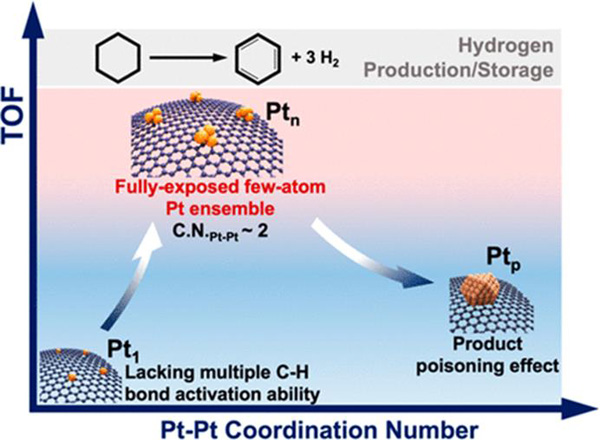 氫氣具有能量密度高及經濟環(huán)保的優(yōu)點,但氫氣的存儲和運輸一直是阻礙氫能規(guī)模應用的瓶頸。利用液態(tài)有機儲氫介質(LOHC),例如環(huán)己烷、十二氫咔唑等脫氫反應可以制氫,結合其反向加氫反應,可實現(xiàn)氫氣的可逆儲放和高效輸運。由于LOHC脫氫過程的活性催化組分主要是貴金屬催化材料,因此通過最大限度地提高貴金屬利用率來增強其催化性能具有重要的科學意義和工業(yè)應用價值。