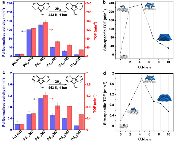 在上述研究工作基礎之上,研究團隊發(fā)現(xiàn)在十二氫咔唑脫氫制氫反應中,亞納米尺度全暴露Pdn團簇催化材料亦表現(xiàn)出優(yōu)異的脫氫制氫性能。同時基于不同Pd物種對CO吸附模式的差異性,通過紅外光譜對不同催化劑表面Pd的分散狀態(tài)進行了定量描繪,估計出不同結構Pd物種在催化劑中的比例,并結合X射線吸收譜分析結果,建立不同尺度Pd物種的平均配位數(shù)與本征活性TOF之間的構效關系,結果表明高活性亞納米尺度Pdn 金屬團簇具有有利于活化反應物分子的金屬集團位點以及抑制產物強吸附行為的特點(如圖2所示)。上述發(fā)現(xiàn)對設計新一代亞納米尺度高效制氫金屬催化材料提供重要的科學依據(jù)和理論指導。