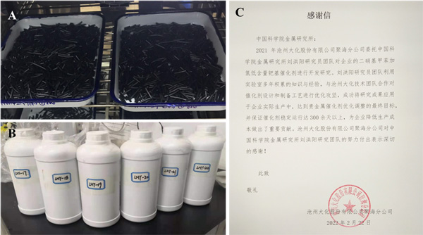 同時,劉洪陽研究團隊將亞納米尺度金屬催化材料的設計理論用于指導實際工業(yè)催化劑的生產,成功開發(fā)二硝基甲苯加氫低含量鈀基催化劑,2021年在中化集團滄州大化12萬噸催化加氫工藝中實現(xiàn)工業(yè)應用,已經穩(wěn)定運行超過300余天,受到企業(yè)的充分認可(如圖3所示),助力企業(yè)降低生產成本、低碳減排。
