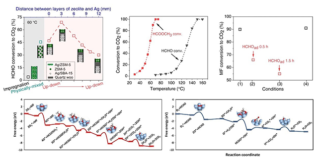 近日,中國(guó)科學(xué)院大連化學(xué)物理研究所理論催化創(chuàng)新特區(qū)研究組研究員肖建平團(tuán)隊(duì)、碳基能源納米材料研究組副研究員焦峰等與大連理工大學(xué)教授曲振平團(tuán)隊(duì)就甲醛氧化消除雙功能催化劑研發(fā)開展合作,通過(guò)理論與實(shí)驗(yàn)協(xié)作,揭示了分子篩—金屬(ZSM-5||Ag)雙功能催化劑中,組分間緊密程度對(duì)甲醛氧化活性的調(diào)控機(jī)制。
