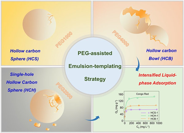 中空碳材料因其獨(dú)特的空腔結(jié)構(gòu),高的比表面積及孔隙率等優(yōu)點(diǎn),在催化、吸附、儲(chǔ)能和生物醫(yī)學(xué)等領(lǐng)域有著廣泛的應(yīng)用前景。但是,中空碳材料的殼壁往往會(huì)阻礙大分子擴(kuò)散,使空腔失去作用,極大限制了中空碳材料的性能及應(yīng)用范圍。近日,為了提高空腔的利用效率以及拓展中空碳材料的應(yīng)用范圍,青島能源所王光輝研究員聯(lián)合浙江工業(yè)大學(xué)朱藝涵教授開發(fā)了一種聚乙二醇(PEG)分子輔助的策略合成單開口中空碳球(HCH),并進(jìn)一步研究了其在有機(jī)染料分子吸附過程中的性能及空間限域效應(yīng),相關(guān)研究結(jié)果發(fā)表在Chemistry of Materials《材料化學(xué)》雜志上。