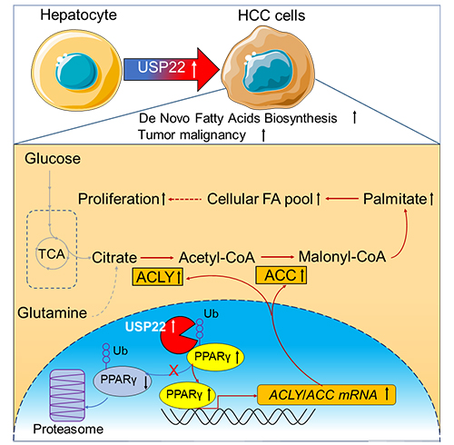 近日,中國科學院大連化學物理研究所生物分子功能與機制研究組研究員樸海龍團隊與生物分子高分辨分離分析及代謝組學研究組研究員許國旺團隊,以及大連醫科大學附屬第一醫院教授譚廣團隊合作,在前期對蛋白質泛素化及去泛素化相互作用的研究基礎上(Oncogene,2020;iScience,2019),進一步發現了去泛素化酶USP22可調控肝癌脂代謝的合成過程,并揭示了USP22可通過氧化物酶體增殖物激活受體 (PPAR )促進肝癌脂肪酸合成的新機制,為靶向肝癌脂質合成途徑的藥物開發提供了新思路。