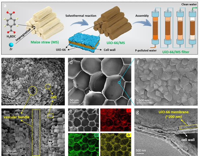 該研究團隊利用溶劑熱法,在玉米秸稈的細胞壁表面均勻生長了一層UiO-66 MOFs膜,制備了UiO-66/MS材料,并將其組裝成了過濾器件。玉米秸稈獨特的生物結構提供了發達的傳質通道,UiO-66的單層膜形態促進了吸附位點的暴露,使UiO-66的本征磷酸鹽吸附性能得以充分發揮。在連續流實驗中(通量300 L m-2 h-1),UiO-66/MS器件可將初始P濃度為3 ppm的磷污染水體修復至中國一級污水排放標準的要求范圍內。同時,該研究也為廢棄玉米秸稈的增值利用提供了一種新途徑。