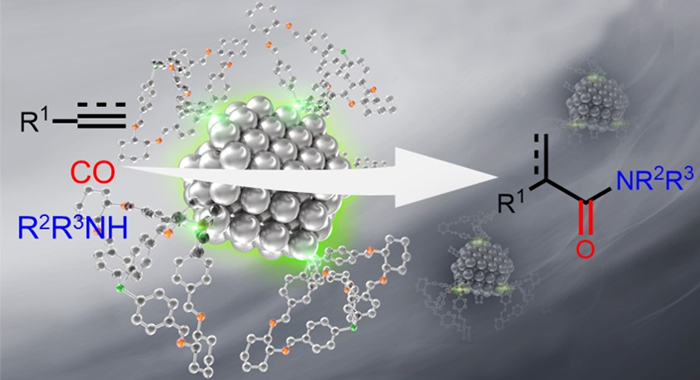 酰胺和 , -不飽和酰胺是天然產物、藥物、農用化學品和功能材料中的重要結構單元。在形成酰胺鍵的眾多方法中,烯烴和炔烴的氫氨基甲酰化是制備酰胺和 , -不飽和酰胺的最直接和原子經濟的方法,迄今為止,配體調控的鈀(Pd)催化烯炔烴氫氨基甲酰化可選擇性合成馬氏或反馬氏酰胺和 , -不飽和酰胺。然而,目前烯炔烴氫氨基甲酰化反應大多依賴于昂貴的均相或多相Pd 催化劑,存在催化劑用量高,反應活性低,區域選擇性差,底物范圍有限以及反應條件苛刻等弊端,嚴重制約了烯炔烴氫氨基甲酰化反應的實際應用。
