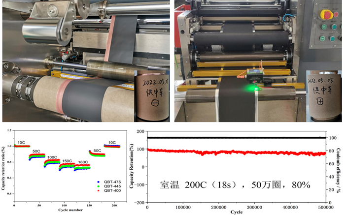 2021年底,該攻關項目,成功立項山東省重點研發計劃(重大科技創新工程)。青島能源所先進儲能材料與技術研究組武建飛研究員和孫曉林高級工程師帶領研究團隊在對活性材料、導電材料、電解液等系統研究的基礎上,對電極制造工藝進行了努力攻關,取得了重要的進展。通過對生產設備設計改造、炭材料優化改性及可控的穿孔集流體設計,確定了電極生產模式,最終成功制備出柔軟性好、高負載量、剝離強度高的高性能電極,目前已經為中車四方所提供了小試生產電極樣品(圖1)。利用該小試生產電極,結合研究組自主開發的電化學預嵌鋰技術,多功能電解液及單體獨特的集成技術,開發出的鋰離子電容器600F單體倍率性能優異,循環壽命取得關鍵性重大突破,達到50萬次,容量保持80%(專利CN202110562980.4; CN202110907508.X)。循環壽命50萬次的鋰離子電容器,不僅滿足新能源汽車、智能電網、風力發電、太陽能等儲能系統要求,而且可以應用到對循環壽命要求更高的地鐵能量回收系統領域。