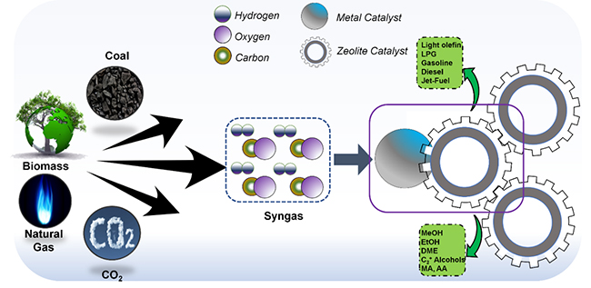 當(dāng)前,在“雙碳”時代背景下,實(shí)現(xiàn)C1小分子的高效催化轉(zhuǎn)化,可提升碳資源的利用效率,同時為社會經(jīng)濟(jì)發(fā)展提供必要的燃料和化學(xué)品。在上述轉(zhuǎn)化過程中,普遍存在多種串聯(lián)催化過程,以金屬或金屬氧化物與分子篩耦合而成的雙功能復(fù)合催化體系,可有效驅(qū)動該過程的高效進(jìn)行,是近年來的研究熱點(diǎn)。