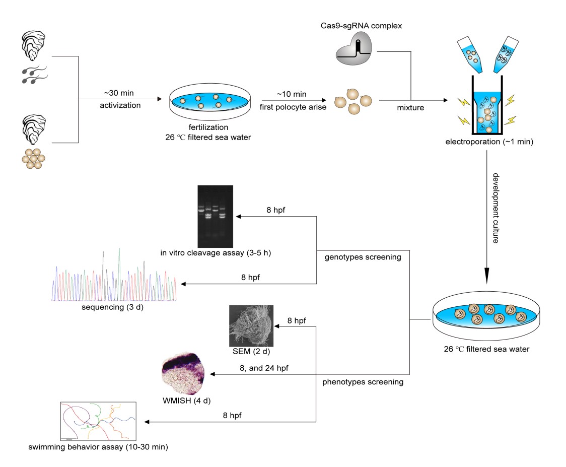 牡蠣為世界大宗水產(chǎn)養(yǎng)殖貝類,但和水產(chǎn)魚類相比,基因組編輯育種技術(shù)在牡蠣中應(yīng)用還處于起步階段。針對牡蠣卵徑小(~50 m)、顯微操作難、幼蟲死亡率高、間接發(fā)育時間時間長以及在獲得可遺傳純系方面難度大、成本高、耗時長的難題,中科院海洋所張琳琳研究團隊經(jīng)過長期的研究攻關(guān),搭建了一套基于電穿孔的Cas9/sgRNA復(fù)合物高通量遞送和突變體快速檢測的技術(shù)平臺,成功實現(xiàn)了對牡蠣(Crassostrea gigas angulate)基因組中標記基因( -tubulin)的高效編輯。