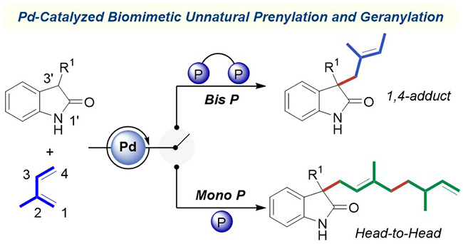 近日,中國科學院大連化學物理研究所仿生催化合成研究組研究員陳慶安團隊在鈀催化吲哚酮戊烯基化和類香葉基化方面取得新進展,利用雙膦配體或單膦配體,改變金屬鈀中心的配位數,實現在吲哚酮上引入C5或者C10結構單元。該策略為在吲哚酮骨架分子上引入不同長度的異戊二烯鏈研究提供了新思路。