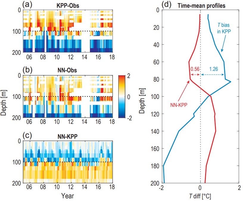 (a) 為目前海洋模式中采用基于物理經驗關系的KPP參數化方案得到的赤道東太平洋溫度模擬誤差(0o,140oW); (b)為應用了基于神經網絡(Neural Network, NN)新參數化方案后的誤差;(c)和(d)為NN方法比 KPP方法的改善效果。結果顯示60-80米的暖誤差減小了約44%