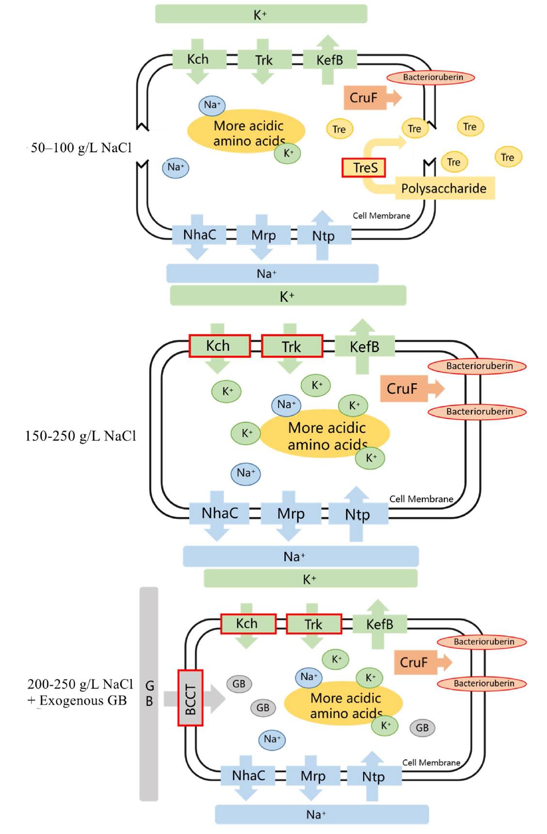 中科院海洋所劉建國研究員團隊從高鹽水體中分離獲得一株嗜鹽古菌,通過生理生化和基因組學研究發現,該嗜鹽古菌含有攝取鉀離子的基因 trkA/trkH/kch、鉀離子轉運基因 kefB、合成海藻糖的基因treS、以及攝取甘氨酸甜菜堿的甜菜堿/肉堿/膽堿轉運蛋白家族基因,在不同鹽濃度下呈現完全不同的滲透調節響應轉變機制。