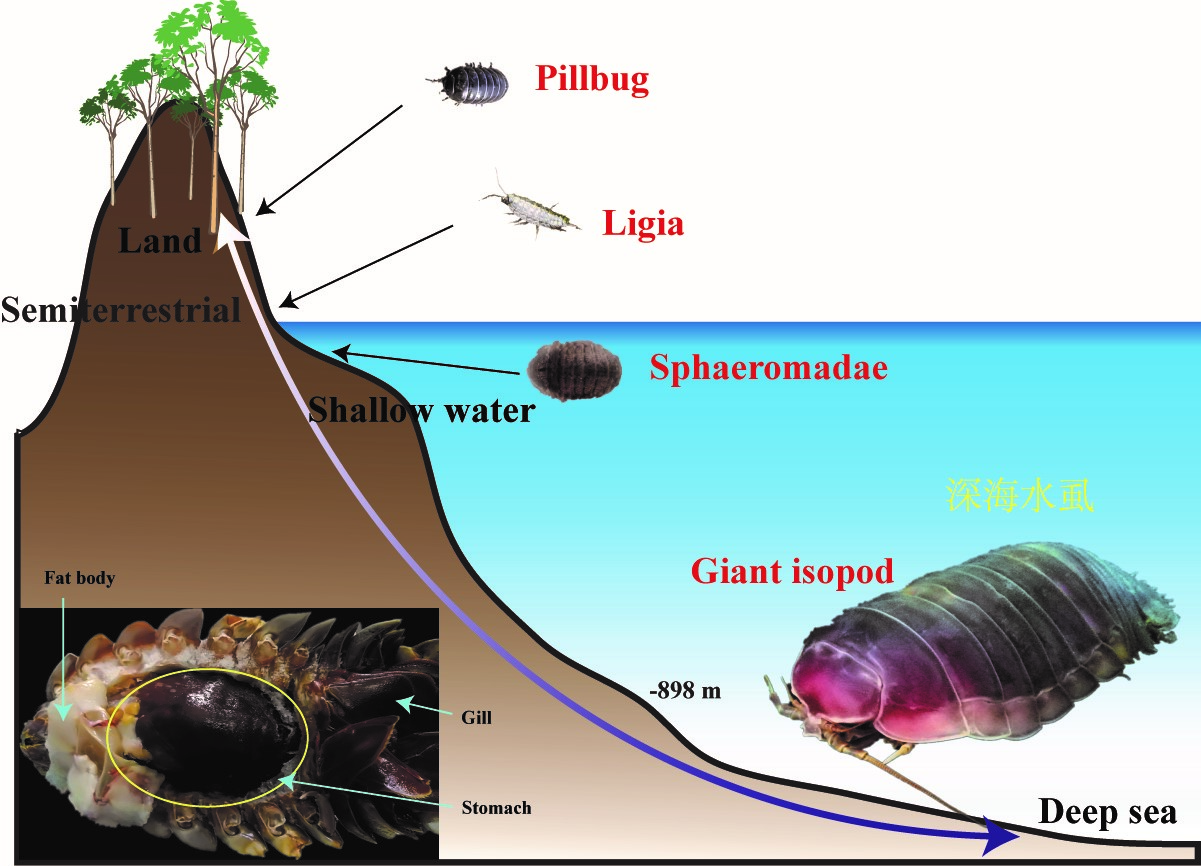 等足類是甲殼動物中少有的既包含水生、半陸生和完全陸生物種,包含深海和淺海物種的類群。不同生態位的類群在體型上存在巨大差異,其中,深海等足類呈現出體型巨大化現象。理論上講,深海環境極其惡劣,其寡營養環境不利于巨型生物的生存,因其需要更多的絕對能量。深海水虱是深海巨型等足類的代表性物種,它們因保持世界上最長的絕食時間記錄(5年以上)而廣受關注。深海水虱基因組的破譯為揭示巨型甲殼動物適應深海寡營養環境的獨特分子機制提供了重要基礎。