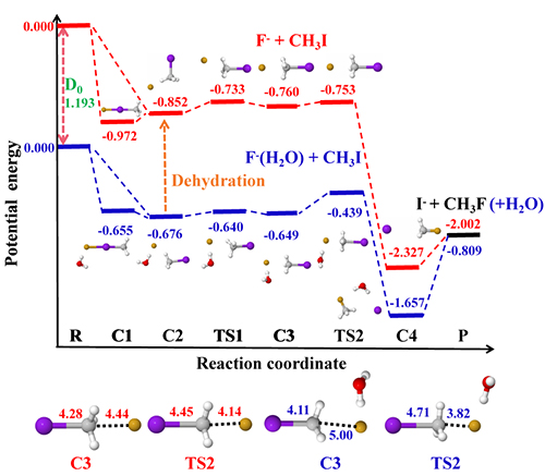 相關(guān)成果以“Dynamical Effects of SN2 Reactivity Suppression by Microsolvation: Dynamics Simulations of the F-(H2O) + CH3I Reaction on a 21-Dimensional Potential Energy Surface”為題,發(fā)表在《物理化學(xué)學(xué)報(bào)》(The Journal of Physical Chemistry Letters)上。該工作的共同第一作者是1113組博士后盧曉曉和李路路。上述工作得到國家自然科學(xué)基金、遼寧省興遼英才計(jì)劃、中國博士后科學(xué)基金等項(xiàng)目的支持。