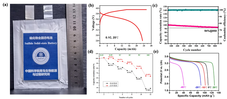 為了突破硫化物全固態軟包鋰電池工業化制備的技術瓶頸,團隊自主創新了多項關鍵技術:制備出厚度低于20 m的超薄電解質膜技術;開發高穩定性電極包覆技術;構建了穩定的電極/電解質界面技術;勻漿、涂布、電極成型等技術;成功開發出具有優異倍率和低溫性能的軟包電池(10C(6min)倍率下充電,容量達到63.5%,-40 下放電容量達31%);率先突破全固態軟包鋰電池循環壽命差的技術難點,成功開發出長循環壽命的全固態軟包鋰電池,循環850次,容量保持率為94%。