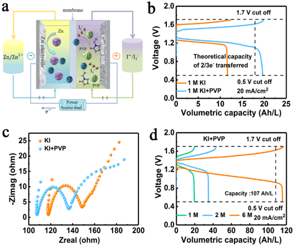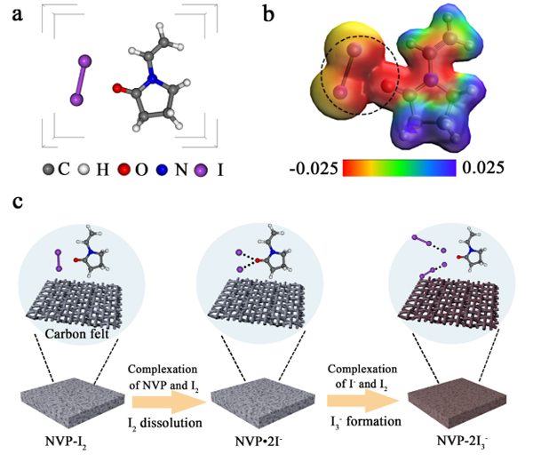 鋅碘液流電池理論容量和能量密度高,但碘正極氧化反應生成的I2會進一步與I-絡合形成I3-,極大限制了碘正極實際使用容量。針對這一問題,通過在碘化鉀正極溶液中引入聚乙烯吡咯烷酮(PVP),單體NVP羰基上氧的孤對電子促進了I2中的I-I鍵斷裂和I-O鍵的形成,進而生成可溶性聚碘絡合物NVP-2I3-,避免了I2與I-絡合形成I3-,有效解鎖了碘正極容量(圖1);組裝的鋅碘液流電池放電容量顯著提升了58%(115 Ah L-1),在70%能量效率下穩定循環600圈(圖2)。研究結果證明了PVP作為一種經濟高效添加劑可有效應用于鋅碘液流電池碘正極,為釋放碘正極容量和開發高性能鋅碘液流電池提供了新的途徑,相關研究工作以“High-capacity zinc-iodine flow batteries enabled by a polymer-polyiodide complex cathode”為題發表于Journal of Materials Chemistry A, 2021, 9, 16093-16098。
