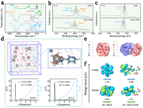 圖3. (a)NAM、ZnCl2和ZnCl2-NAM的紅外光譜;(b-c)ZnCl2和ZnCl2-NAM的高分辨率XPS N 1s和O 1s光譜;(d)ZnCl2-NAM的分子動力學模型,Zn2+-N (NAM)和Zn2+-O (NAM)的徑向分布函數;(e)Zn2+-6H2O(左)和Zn2+-4H2O-NAM(右)溶劑化結構的靜電勢圖;(f)LUMO和HOMO等值面
