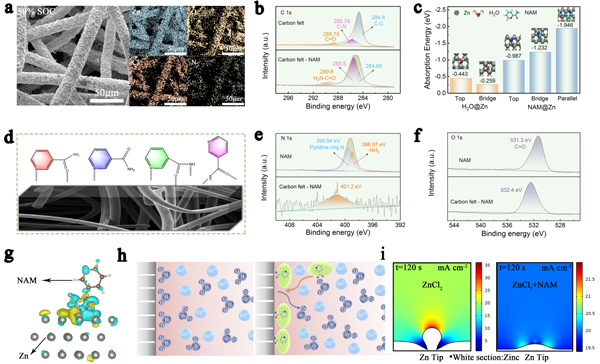 圖4. (a)0.5 M ZnCl2+0.05 M NAM溶液中鍍鋅碳氈的形貌和EDX元素圖;(b)原始碳氈和NAM吸附的碳氈的高分辨率XPS C 1s光譜;(c)Zn (002)平面吸附能比較;(d)NAM在碳纖維上的吸附位點示意圖;(e-f)NAM和NAM吸附的碳氈的高分辨率XPS N 1s和O1s光譜;(g)吸附在Zn (002)平面上的NAM的差分電荷密度;(h)引入NAM前后的電極/溶液界面示意圖;(i)ZnCl2(左)和ZnCl2-NAM(右)中Zn2+通量分布的數值模擬。