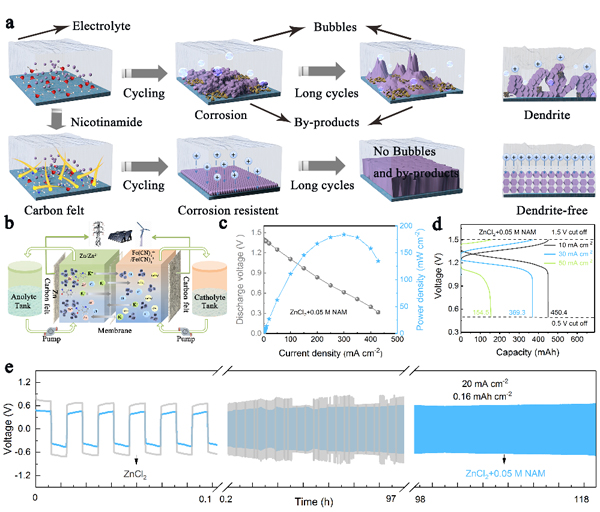 圖5. (a)NAM對鋅沉積的影響示意圖;(b)基于NAM的鋅鐵液流電池的示意圖;(c)使用0.5 M ZnCl2+ 0.05 M NAM負極電解液的鋅鐵液流電池放電極化曲線和功率密度曲線;(d)20 mA cm-2下電池的恒電流電壓曲線; (e)Zn//Zn對稱電池的長期恒流充放電比較。