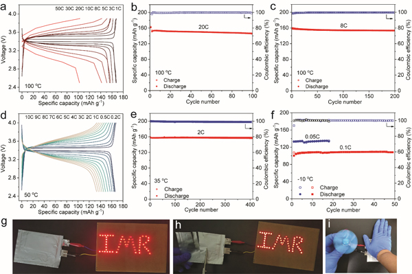 圖2. 固態鋰金屬電池的寬溫、倍率及安全性能測試。