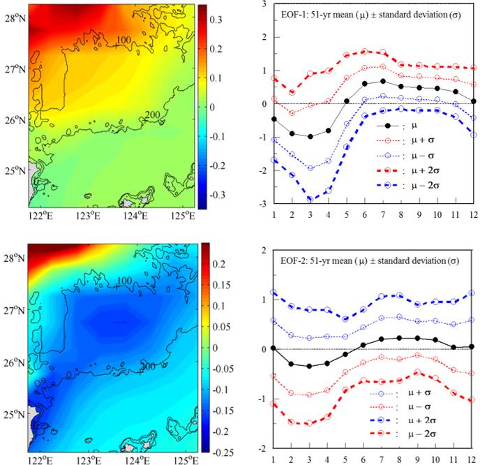 左圖:內陸架振蕩型(EOF-1,上)和外陸架振蕩型(EOF-1,下);右圖:向陸架/向外海雙向入侵可以解釋為以中繼方式進行