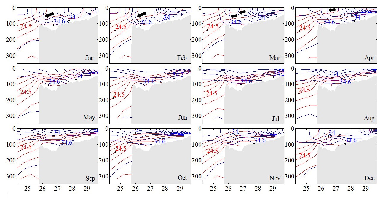 研究還分析了次表層等密度面向陸架區露頭(outcropping)的位置隨季節和年際變化,提出低鹽陸架水向外海方向的潛沉滲入和高鹽黑潮水向陸架方向的爬升入侵是一對矛盾體,進一步分析了矛盾的主要方面和次要方面。研究認為,雙向入侵是跨陸架的;動力學上,除受地形抬升外,海洋層結(stratification)的季節變化起重要作用;以24.5等密度面(isopycnal 24.5)為代表的“巨臂露頭”(outcropping giant arm)機制對低鹽陸架水由內陸架向外陸架進而到黑潮區的侵入起到重要的幫助作用。