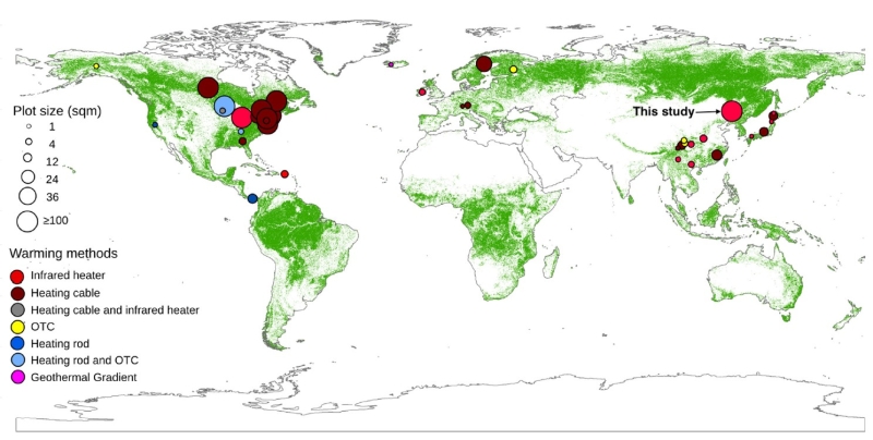 森林是重要的陸地生態系統碳匯,全球變暖將會深刻影響森林的碳匯格局。目前,在全球已建立了數十個森林增溫站點,但絕大多數規模較小(圖1),無法揭示在生態系統尺度上森林氣候變暖的響應規律及其機制。野外增溫的方法分為主動和被動增溫方式,主動增溫主要包括加熱電纜和紅外輻射增溫,通常能穩定控制增溫幅度。相較于其它增溫方式,紅外輻射增溫也更能模擬自然的氣候變暖過程,且對生態系統擾動小。然而,過去開展的森林紅外輻射增溫樣方面積也普遍都較小,樣方面積通常小于12m2。森林生態系統具有結構復雜、地形多變、空間異質性較大等特點,因此,開展大型野外增溫實驗將有助于更好的評估森林生態系統對氣候變暖的響應。目前,國際上僅有兩個研究站點具有足夠大的樣方并開展了此類研究,一個位于美國的Harvard Forest,一個是位于瑞典的Flakaliden Forest,均采用電纜增溫。我國東北地區溫帶森林是區域尺度上重要的森林碳匯,且處于氣候變暖的敏感區域及快速升溫區,然而該地區尚無原位土壤增溫實驗(圖1)。