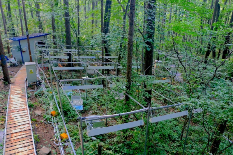 基于此,中科院沈陽生態所方運霆研究員團隊依托遼寧清原森林生態系統國家野外科學觀測研究站建立了東北亞地區最大的森林野外增溫實驗平臺(圖2)。實驗設計增溫和對照2個處理,3個樣方重復,單個樣方面積達到108m2。首次采用聯排紅外輻射燈陣方法進行增溫,結合控溫系統對0-10cm土壤增溫2 。采用全天24小時增溫方式,增溫時間段是每年的無雪期(3月下旬-12月上旬)。增溫平臺的建設目標是評估我國東北典型森林生態系統碳匯對增溫的響應及其機制。該平臺于2017年開始籌建,并于2018正式運行。