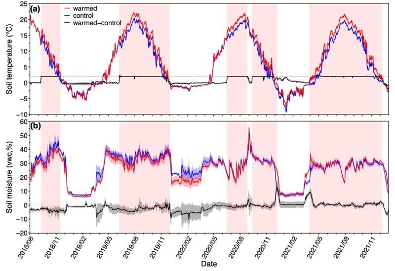 圖3 清原森林土壤增溫對0-10cm土壤溫度和濕度的影響(紅色背景區域表示增溫時段)