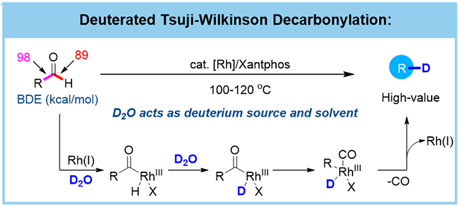 醛類化合物來源廣泛,廉價易得,通過醛類化合物的脫羰氘代反應來制備相應的氘代化合物具有很大的優勢。就醛類化合物甲?;奶細?碳碳鍵的解離能(BDE)來講,相比于甲?;闹苯与?,脫羰氘代更具挑戰性,至今尚未實現。盡管銠催化醛類化合物的Tsuji-Wilkinson脫羰反應有了很好地發展,但是通常需要較高的溫度(>160 oC)。因此,在相對溫和的條件下實現銠催化醛的脫羰/氘代反應具有一定的研究價值。