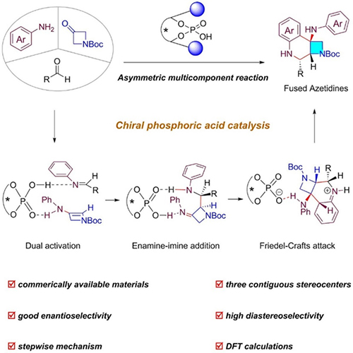 本工作中,陳慶安團隊選擇商業可得的芳胺、芳醛和氮雜環丁酮為起始原料,探索不對稱小分子催化反應研究,構建了光學純氮雜環丁烷的新方法。研究發現,胺與醛酮類底物易于相互反應得到多種活性中間體,例如亞胺、烯胺以及交叉Aldol產物等,這使得反應體系復雜且不可控。因此,實現高區域選擇性、對映選擇性和非對映選擇性地生成手性氮雜環丁烷有較大的困難。為解決上述問題,團隊通過引入手性磷酸(CPA)作為催化劑,通過較好的非對映選擇性和對映選擇性,經一步反應構建了三個連續的立體中心。DFT計算表明,該反應是經由烯胺亞胺加成和Friedel-Crafts進攻的分步過程實現的。該策略實現了小分子催化構建手性氮雜環丁烷結構,為不對稱多組分反應研究提供了新思路。