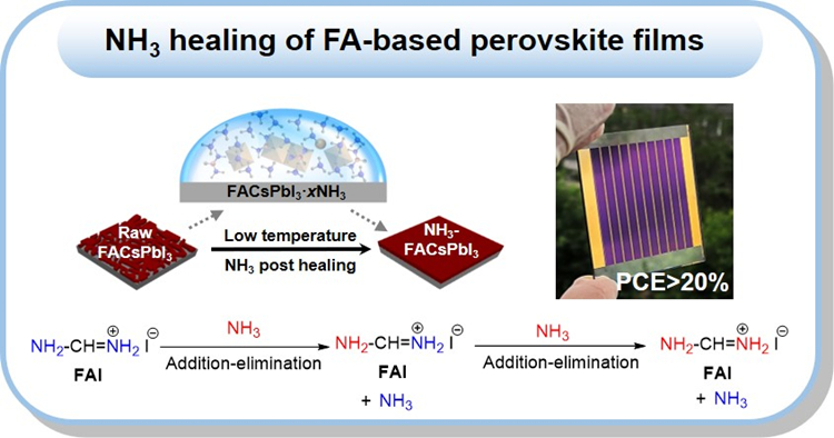 青島能源所是世界上最早從事甲脒基鈣鈦礦材料研究的單位之一。針對其大面積成膜問題,固態能源系統技術中心聯合青島科技大學研究人員揭示了在脂肪胺環境中甲胺和甲脒體系的鈣鈦礦潛在的化學副反應,基于此發現進一步提出氨氣用于甲脒基鈣鈦礦薄膜的后修復的研究成果,相關研究發表在Nature Communications《自然-通訊》上。