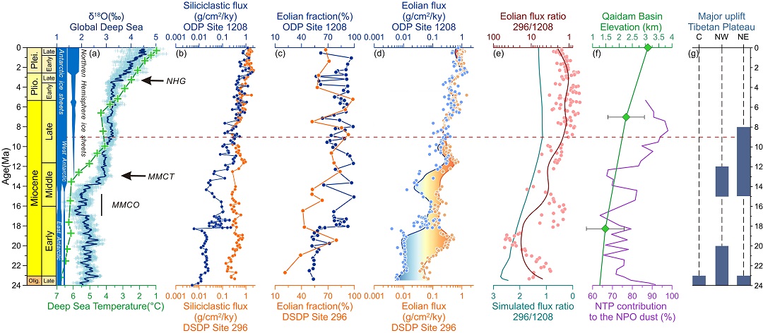 研究人員通過西太平洋風塵沉積記錄揭示出北半球西風帶在中新世之前靠近北緯30度,在早-晚中新世(23-9百萬年前)期間受青藏高原隆升驅動,逐漸向北移動到現今位置(~40 N),隨后在長時間尺度上保持相對穩定。研究首次重建了北半球西風帶中新世以來的長期演化歷史,對于理解全球氣候系統演化與高原隆升之間的流固耦合和構造-氣候聯系有重要意義。