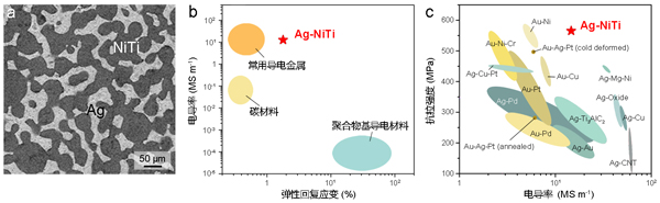 研究人員利用銀和鎳鈦之間超過300 的熔點差異,采用工業生產電接觸材料中常用的無壓熔滲工藝,將銀熔體浸滲到熱壓燒結的多孔鎳鈦骨架中,并通過綜合調控骨架燒結溫度和熔滲溫度,在避免發生界面反應的前提下,實現了銀熔體完全填充骨架,獲得了不含雜質相的致密銀-鎳鈦塊體復合材料。材料中銀和鎳鈦兩相各自保持連續,并且在三維空間相互貫穿,兩相界面表現為冶金結合,如圖1a所示。銀基體良好的空間連通性能夠提供連續的電子傳輸通道,賦予材料超過10MS m-1的高電導率,而連續的鎳鈦增強相能夠起到高效的強化作用。在變形過程中,鎳鈦相發生應力誘導馬氏體相變,在消耗外加機械能的同時減輕應力集中,而卸載后鎳鈦相能夠自發逆相變,引起材料整體產生彈性回復,從而賦予該電接觸材料超過1.7%的大彈性變形能力,是常用塊體導電金屬材料的3倍以上,如圖1b所示。此外,兩相微觀三維互穿與機械互鎖有利于促進二者之間的應力傳遞,避免局部應力集中導致過早損傷,并且能夠將微觀塑性變形與開裂約束在各自相內部,阻礙損傷演化并貫穿材料引起整體失效,因而進一步提高了電接觸材料的強度和損傷容限,使其表現出約1500MPa和560MPa的抗壓和抗拉強度,與現有銀基電接觸材料相比,在同等電導率前提下,強度約提高一倍,如圖1c所示。彈性、強度與電導率的優異結合使得新型銀-鎳鈦電接觸材料有望在電路與電器等領域獲得廣泛應用。